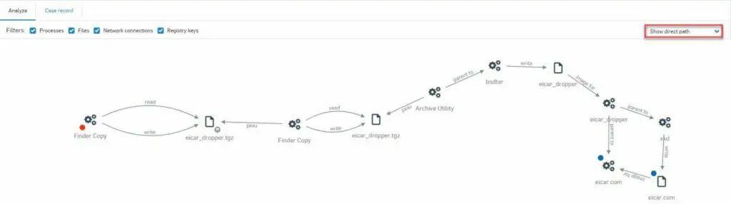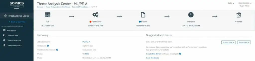 Sophos EDR มีฟีเจอร์ที่เรียกว่า Threat Cases ซึ่งสามารถแสดงเหตุการณ์ทั้งหมดที่เกี่ยวข้องกับการโจมตีที่ตรวจพบ ช่วยให้ผู้ดูแลระบบเข้าใจได้ง่ายว่า ไฟล์ โปรเซส และ Registry Key ไหนที่ได้รับผลกระทบจากมัลแวร์บ้าง ทั้งยังสามารถแสดงผลเป็นแผนภาพการโจมตี ตั้งแต่จุดเริ่มต้น ไปจนถึงจุดที่การโจมตีจบ (หรือถูกหยุด) เหล่านี้ ทำให้ผู้ดูแลระบบสามารถค้นหาต้นตอของปัญหาได้อย่างรวดเร็วและแม่นยำ พร้อมหาวิธีการปิดช่องโหว่ไม่ให้ถูกโจมตีซ้ำได้อีก