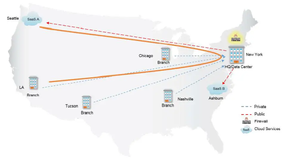 ตามแนวทางและศูนย์กลางการรับส่งข้อมูลปลายทางสู่อินเทอร์เน็ตทั้งหมด (all internet-destined traffic) จะถูกส่งกลับเข้ามาผ่านไฟร์วอลล์ที่ติดตั้งที่ศูนย์กลาง ซึ่งวิธีการ “ดุมล้อ – Hub and spoke” (การขนส่งที่ทุกอย่างจะถูกส่งกลับมาที่ศูนย์กลางแล้วค่อยส่งกระจายออกไป) นี้ออกแบบมาอย่างตรงไปตรงมาเพื่อให้เกิดความปลอดภัย แต่อย่างหลีกเลี่ยงไม่ได้คือการส่งข้อมูลกลับมาที่ศูนย์กลางนั้นทำให้เกิดสมรรถนะที่ต่ำกว่าความเหมาะสมในสภาพแวดล้อมที่บริการคลาวด์มีความสำคัญ (ในรูปโปรดสังเกตว่าสาขาในลอสแองเจลิสเข้าถึงบริการในซีแอตเทิลผ่านศูนย์ข้อมูลที่อยู่ในนิวยอร์ก)