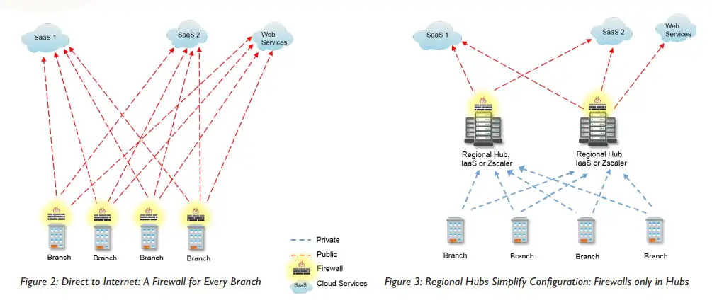 ด้านซ้ายของไดอะแกรมต่อไปนี้แสดงให้เห็นถึงแนวทางแบบ direct-to-net และความซับซ้อนที่เกี่ยวข้อง: การเข้าสู่อินเทอร์เน็ตโดยตรงหมายถึงการติดตั้งไฟร์วอลล์ที่ทุกสาขา ดังนั้นเราต้องเลือกวิถีที่จะใช้ระหว่าง “การรวมศูนย์อย่างเต็มที่” (แบ็คฮอล) หรือ “การกระจายอย่างเต็มที่” (ตรงสู่เน็ต)?